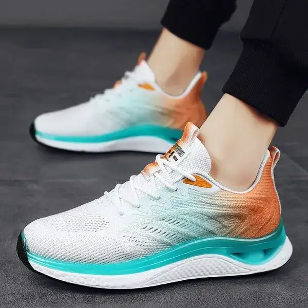 • Stylish Gradient Pattern with Sporty Accents:Gradient design in White Blue, White Orange, and Black with sporty accents and "FASHION AIR" branding offers a trendy, athletic look.