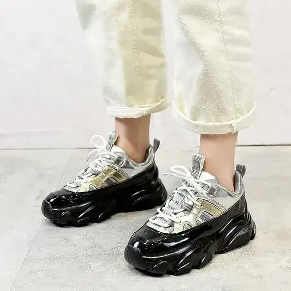 Womens Contrast Panel Sneakers | Light-Reflective Mid-Top Platform Shoes in Black, Silver