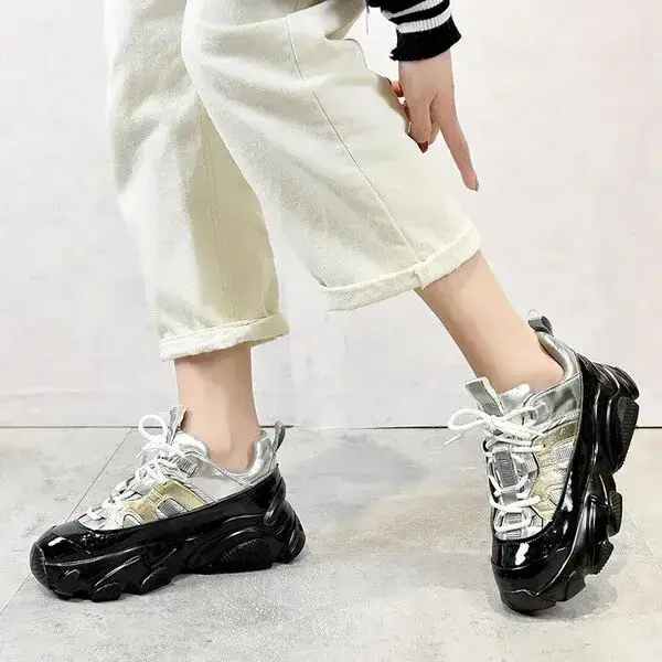 - Contrast Panel Design:Chic Black and Silver with a chunky platform.