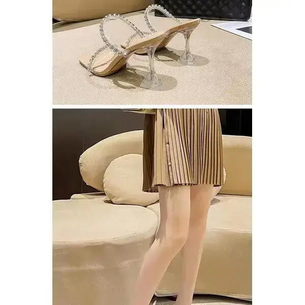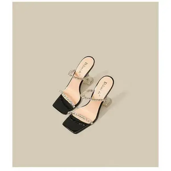 Womens Rhinestone Slippers | UV-Resistant Square-Toe High-Heel Shoes in Black, Peach, White